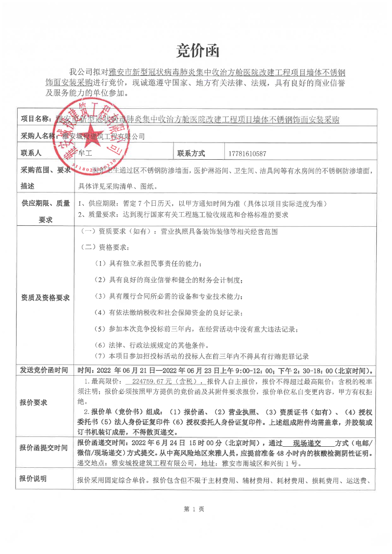 雅安市新型冠狀病毒肺炎集中收治方艙醫(yī)院改建工程項(xiàng)目墻體不銹鋼飾面安裝采購(gòu)競(jìng)價(jià)公告