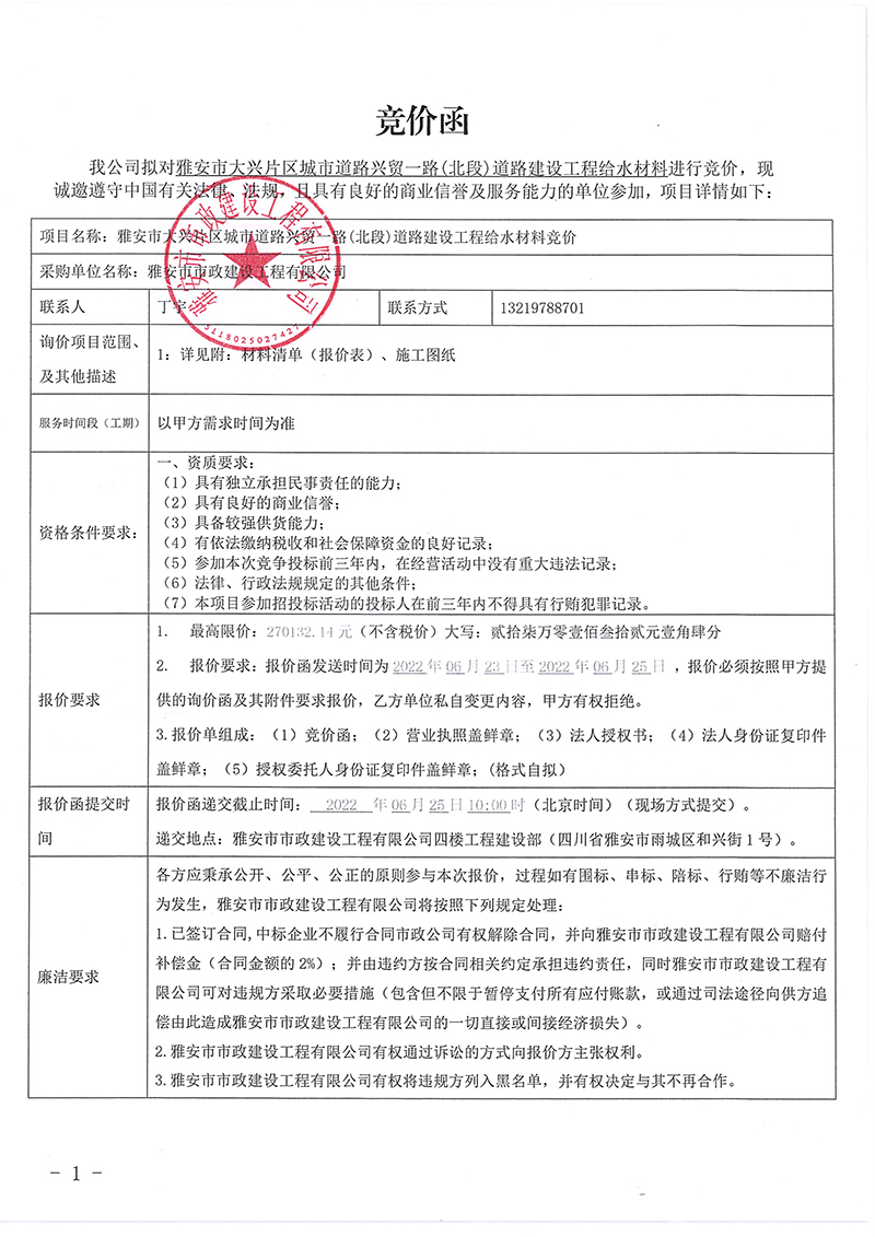 雅安市大興片區(qū)城市道路興貿一路(北段) 道路建設工程給水材料采購公告