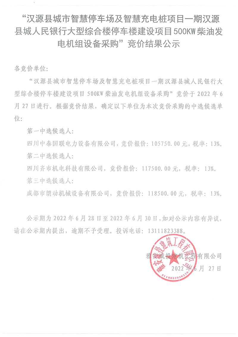 漢源縣城市智慧停車場及智慧充電樁項目一期漢源縣城人民銀行大型綜合樓停車樓建設(shè)項目500kw柴油發(fā)電機(jī)組設(shè)備采購競價結(jié)果公告