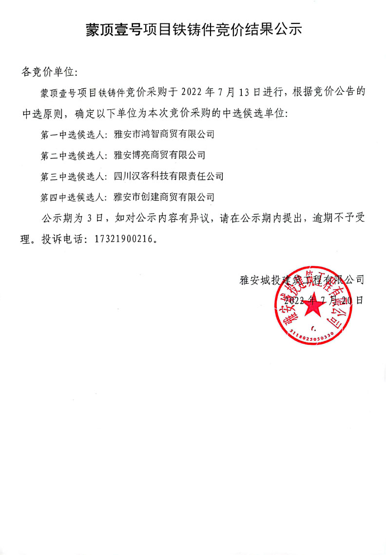 蒙頂壹號項(xiàng)目鐵鑄件競價(jià)結(jié)果公示