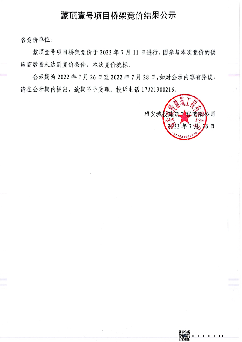 蒙頂壹號(hào)項(xiàng)目橋架競(jìng)價(jià)結(jié)果公示