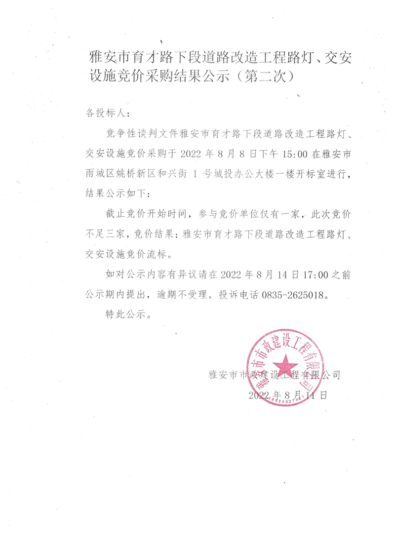雅安市育才路下段道路改造工程路燈、交安設(shè)施競價(jià)采購結(jié)果公示(第二次)