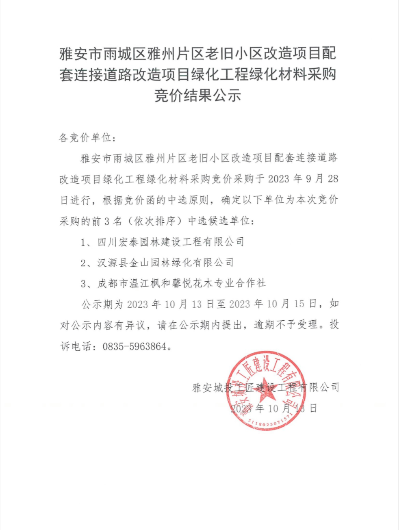 雅安市雨城區(qū)雅州片區(qū)老舊小區(qū)改造項目配套連接道路改造項目綠化工程綠化材料采購競價結(jié)果公示