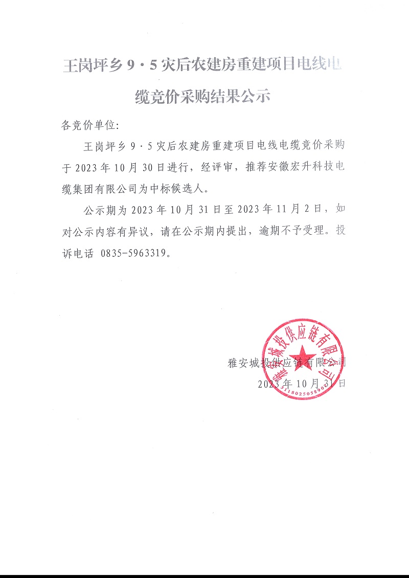 王崗坪鄉(xiāng)9.5災(zāi)后農(nóng)建房重建項目電線電纜競價采購結(jié)果公示