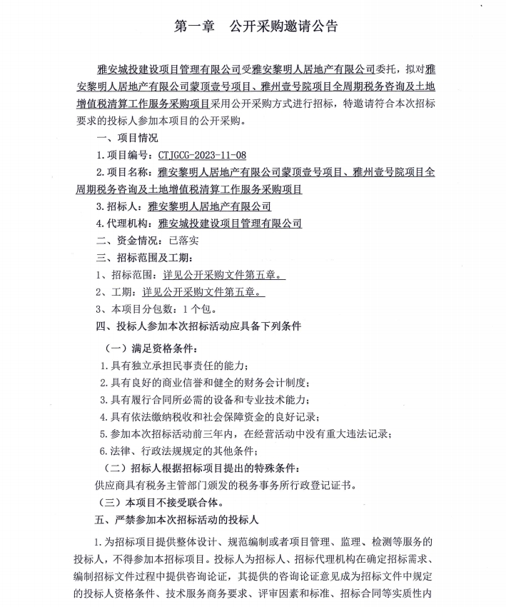 雅安黎明人居地產(chǎn)有限公司蒙頂壹號項(xiàng)目、雅州壹號院項(xiàng)目全周期稅務(wù)咨詢及土地增值稅清算工作服務(wù)采購項(xiàng)目公開采購邀請公告