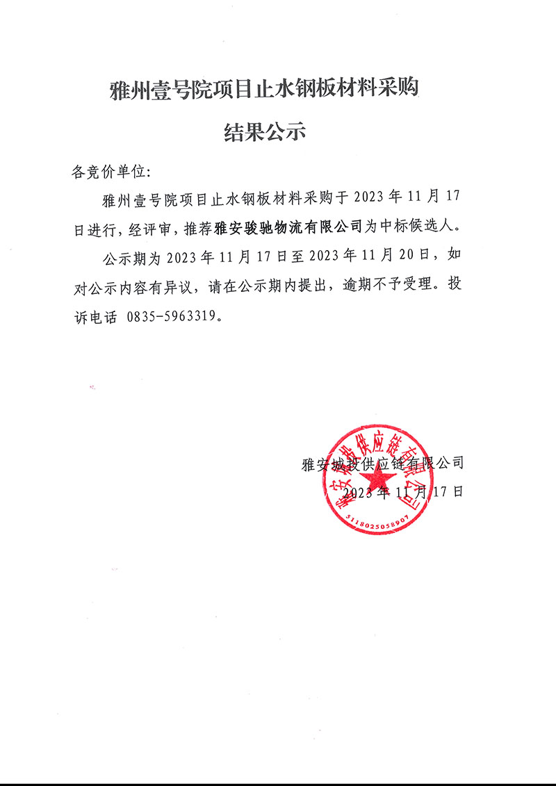 雅州壹號院項目止水鋼板材料采購結(jié)果公示