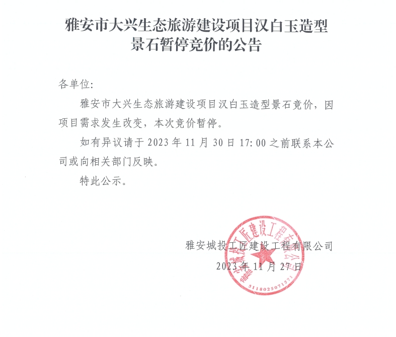 雅安市大興生態(tài)旅游建設(shè)項目漢白玉造型景石暫停競價的公告