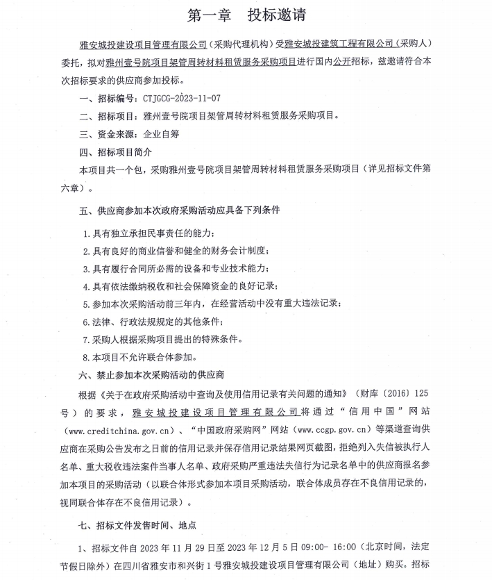 雅州壹號院項(xiàng)目架管周轉(zhuǎn)材料租賃服務(wù)采購項(xiàng)目投標(biāo)邀請公告