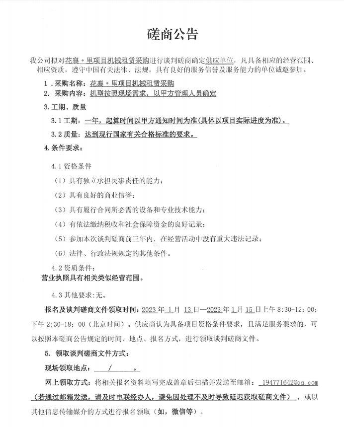 花襄·里項目機(jī)械租賃采購談判磋商公告