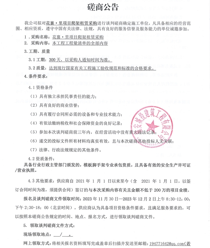 花襄·里項(xiàng)目爬架租賃采購(gòu)磋商公告