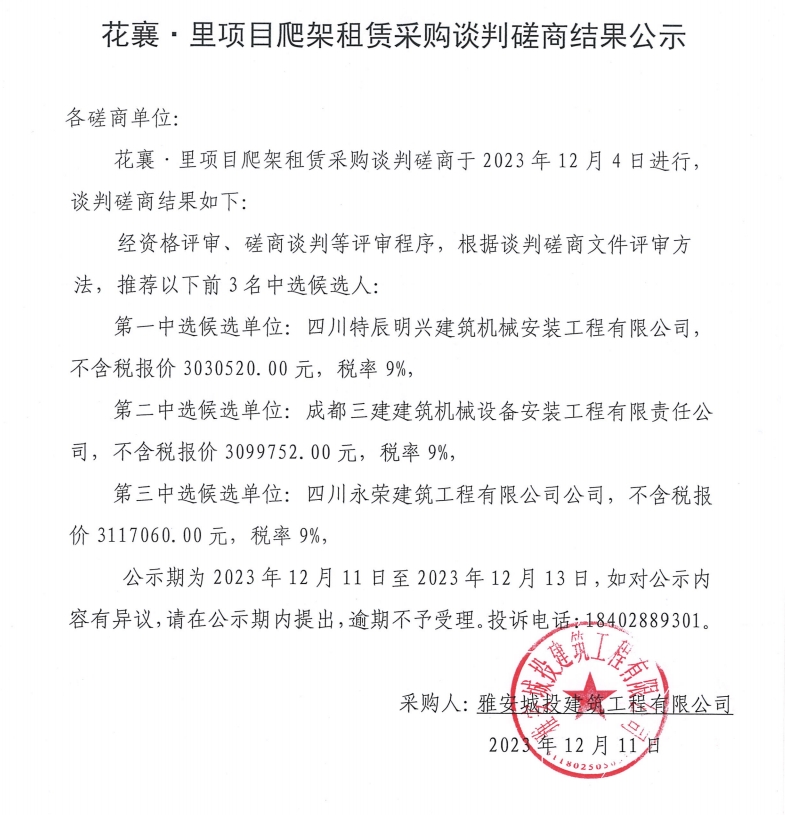 花襄·里項目爬架租賃采購談判磋商結(jié)果公示