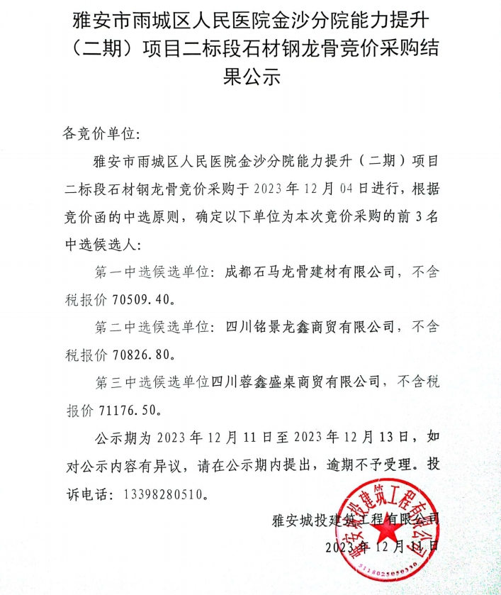 雅安市雨城區(qū)人民醫(yī)院金沙分院能力提升(二期)項目二標段石材鋼龍骨采購競價采購結(jié)果公示