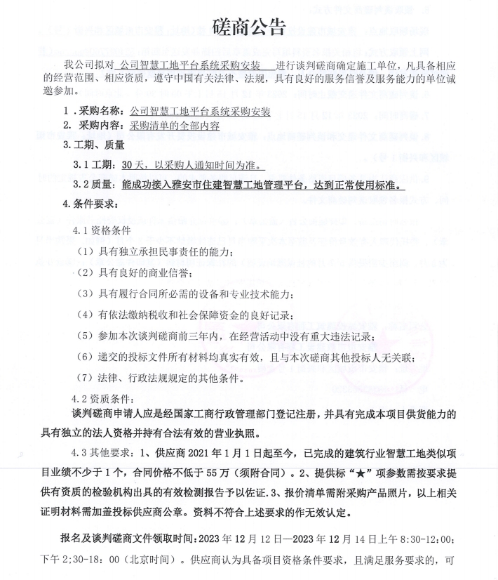 公司智慧工地平臺系統(tǒng)采購安裝談判磋商公告