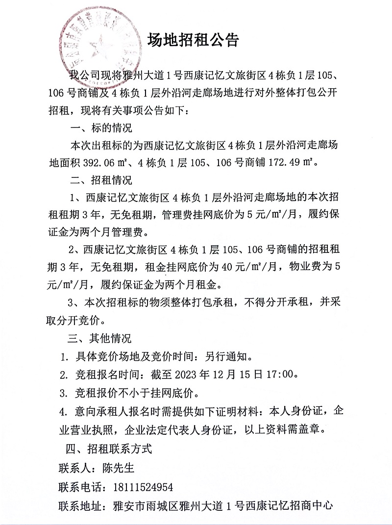 雅州大道1號西康記憶文旅街區(qū)4棟負1層105、106號商鋪及4棟負1層外沿河走廊場地招租公告