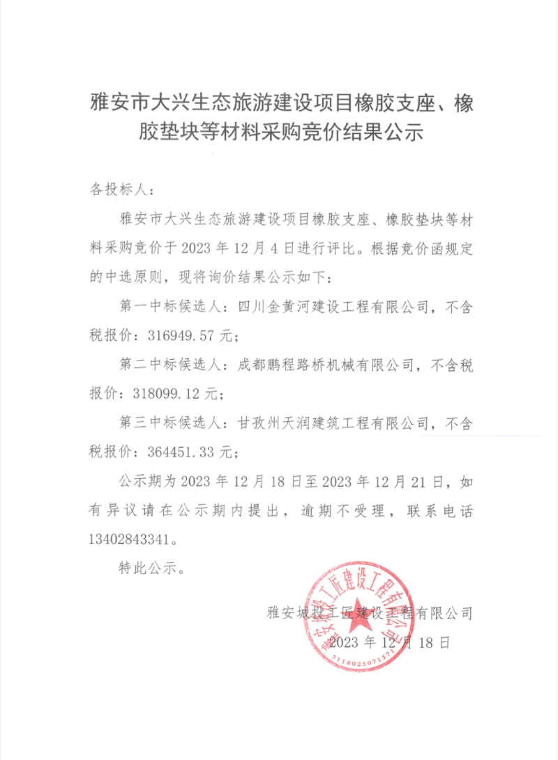 雅安市大興生態(tài)旅游建設(shè)項(xiàng)目橡膠支座、橡膠墊塊等材料采購競價結(jié)果公示