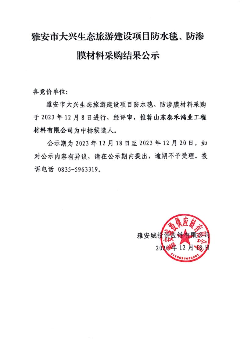 雅安市大興生態(tài)旅游建設項目防水毯、防滲膜材料采購結果公示