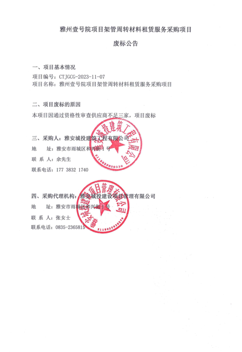 雅州壹號項目架管周轉(zhuǎn)材料租賃服務采購項目廢標公告