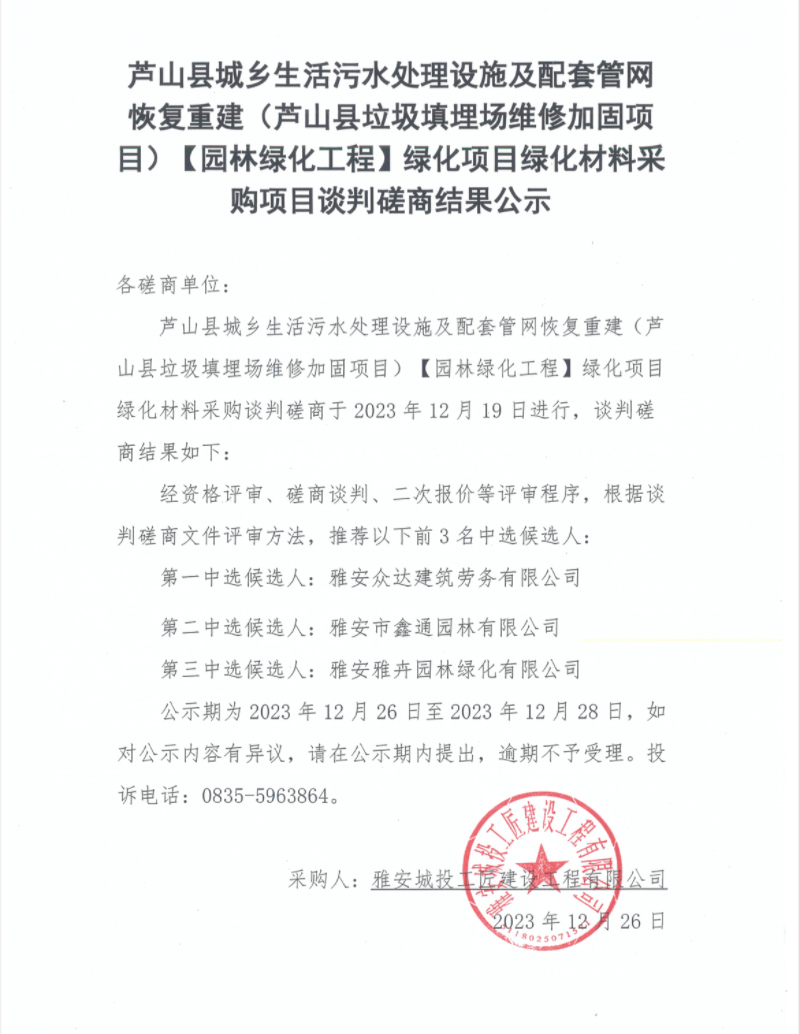 蘆山縣城鄉(xiāng)生活污水處理設(shè)施及配套管網(wǎng)恢復(fù)重建(蘆山縣垃圾填埋場(chǎng)維修加固項(xiàng)目)【園林綠化工程】綠化項(xiàng)目綠化材料采購(gòu)項(xiàng)目談判磋商結(jié)果公示
