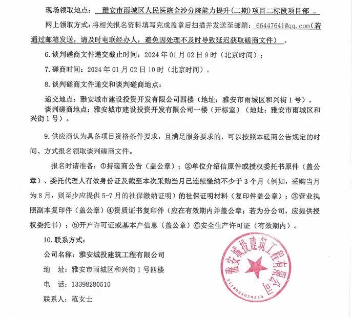 雅安市雨城區(qū)人民醫(yī)院金沙分院能力提升(二期)項(xiàng)目二標(biāo)段人造石材料采購(gòu)談判磋商公告