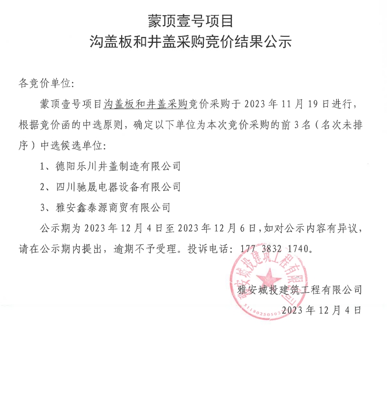 蒙頂壹號(hào)項(xiàng)目溝蓋板和井蓋采購競價(jià)結(jié)果公示