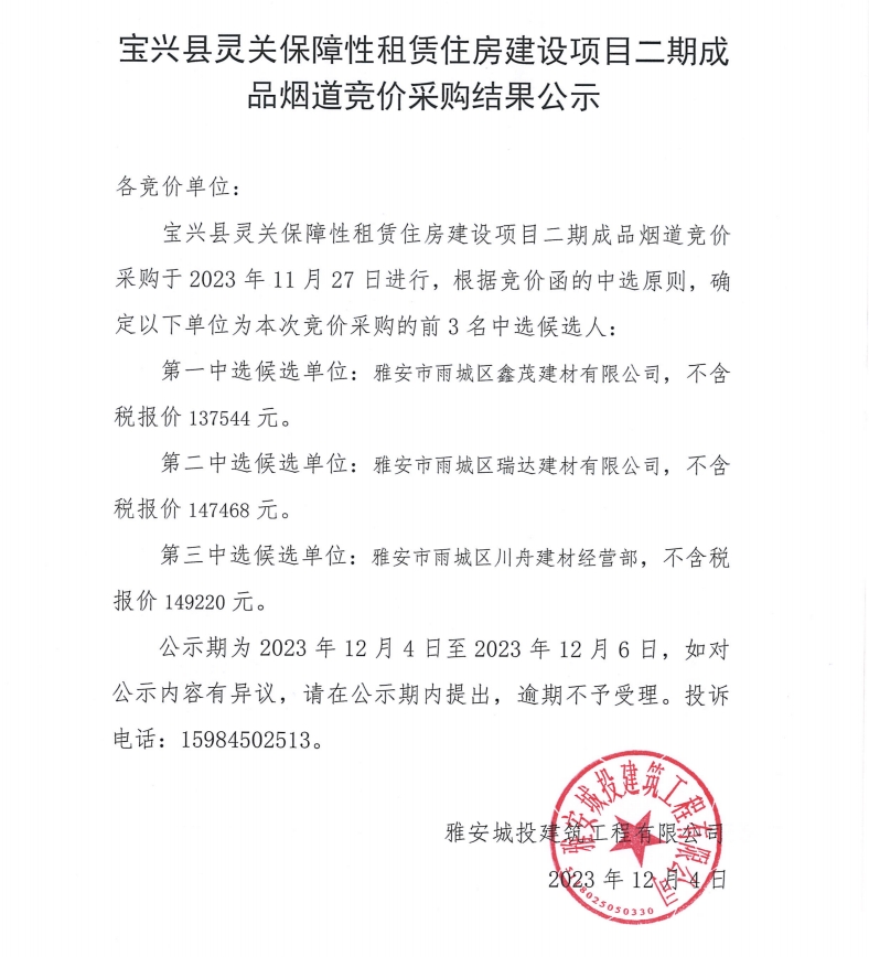 寶興縣靈關(guān)保障性租賃住房建設(shè)項(xiàng)目二期成品煙道競價(jià)采購結(jié)果公示