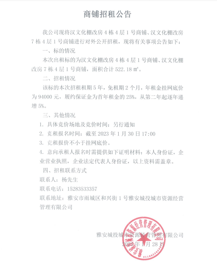 商鋪招租公告