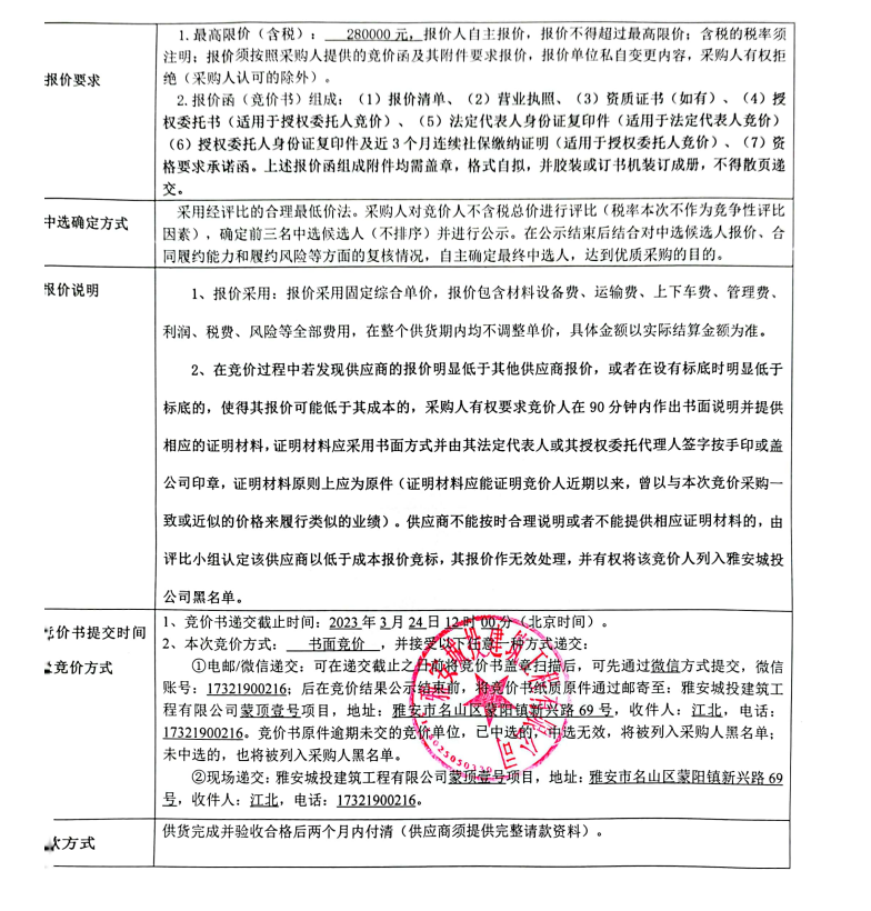 蒙頂壹號項目拉絲不銹鋼采購競價公告