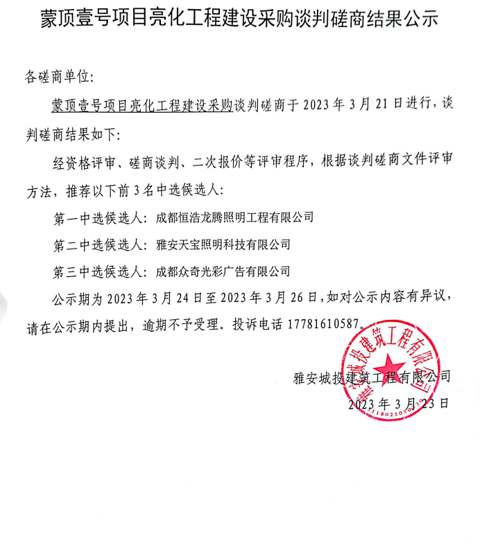 蒙頂壹號(hào)項(xiàng)目亮化工程建設(shè)采購(gòu)談判磋商結(jié)果公示