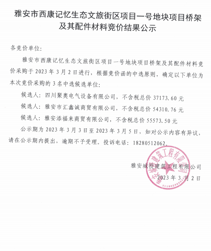 雅安市西康記憶生態(tài)文旅街區(qū)項目一號地塊項目橋架及其配件材料競價結(jié)果公示