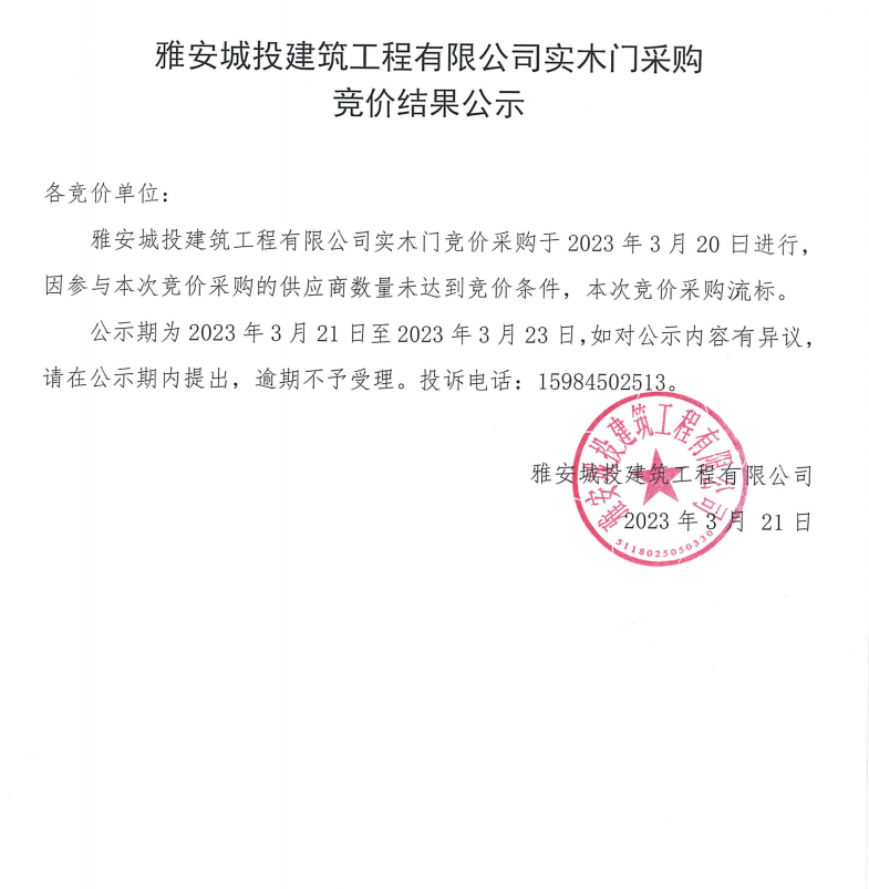 雅安城投建筑工程有限公司實(shí)木門采購競價(jià)結(jié)果公示