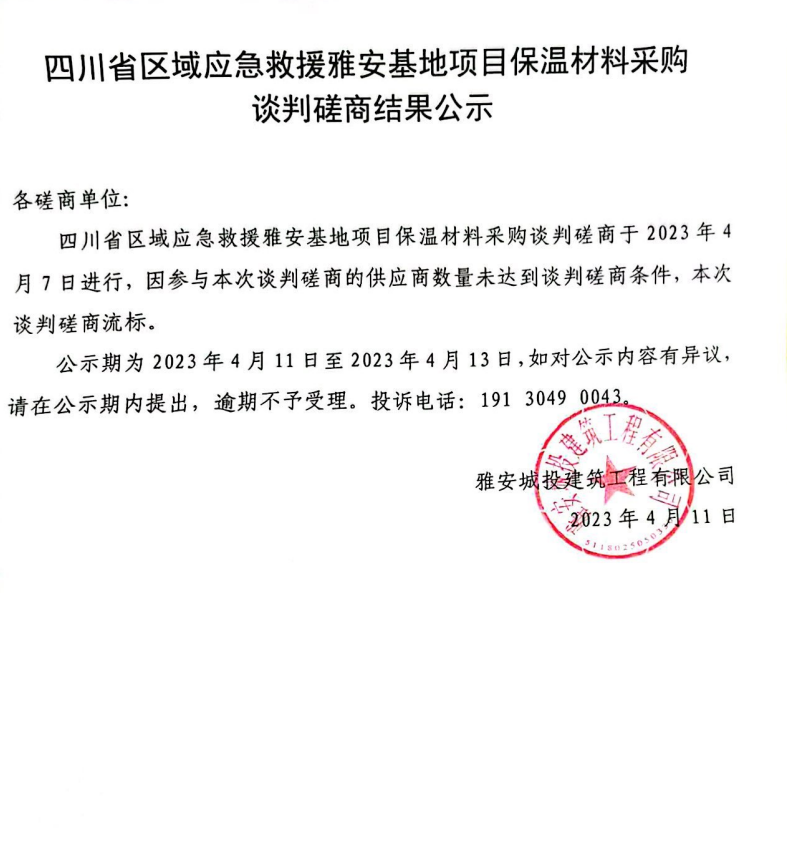 四川省區(qū)域應(yīng)急救援雅安基地項(xiàng)目保溫材料采購(gòu)談判磋商結(jié)果公示
