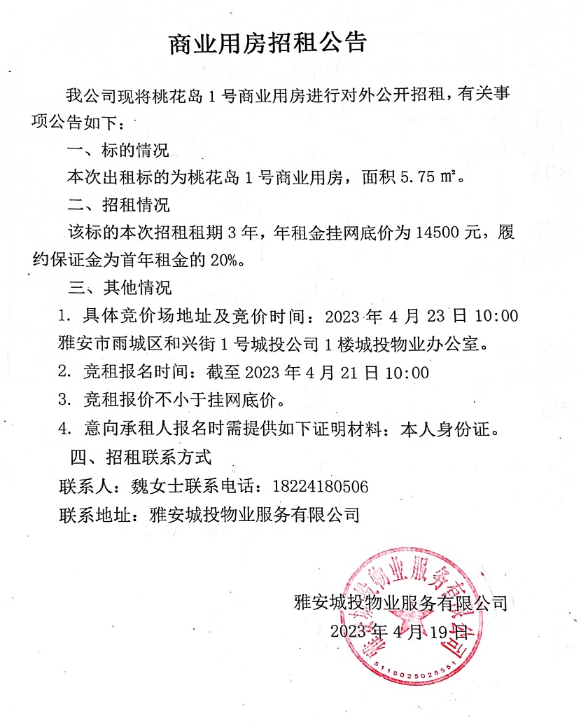 桃花島1號商業(yè)用房招租公告