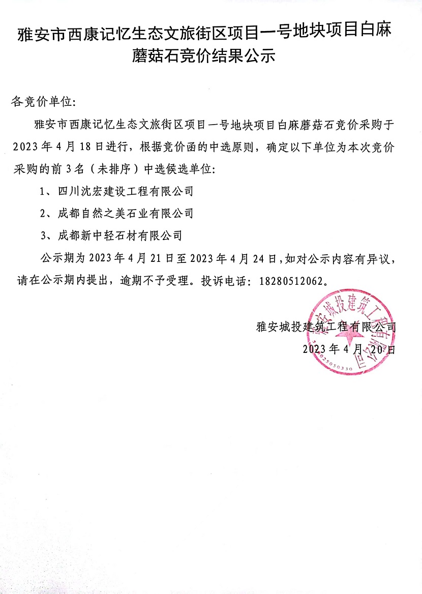 雅安市西康記憶生態(tài)文旅街區(qū)項目一號地塊項目白麻蘑菇石競價結果公示