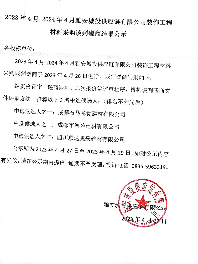 2023年4月-2024年4月雅安城投供應(yīng)鏈有限公司裝飾工程材料采購(gòu)談判磋商結(jié)果公示