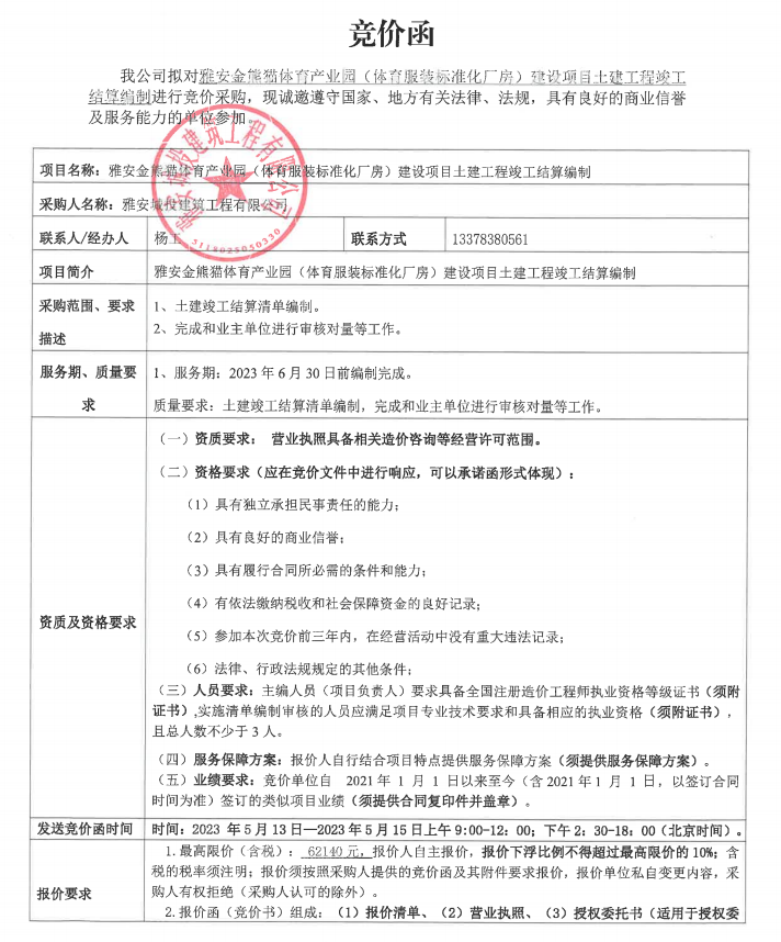 雅安金熊貓體育產(chǎn)業(yè)園(體育服裝標準化廠房)建設項目土建工程竣工結算編制競價公告