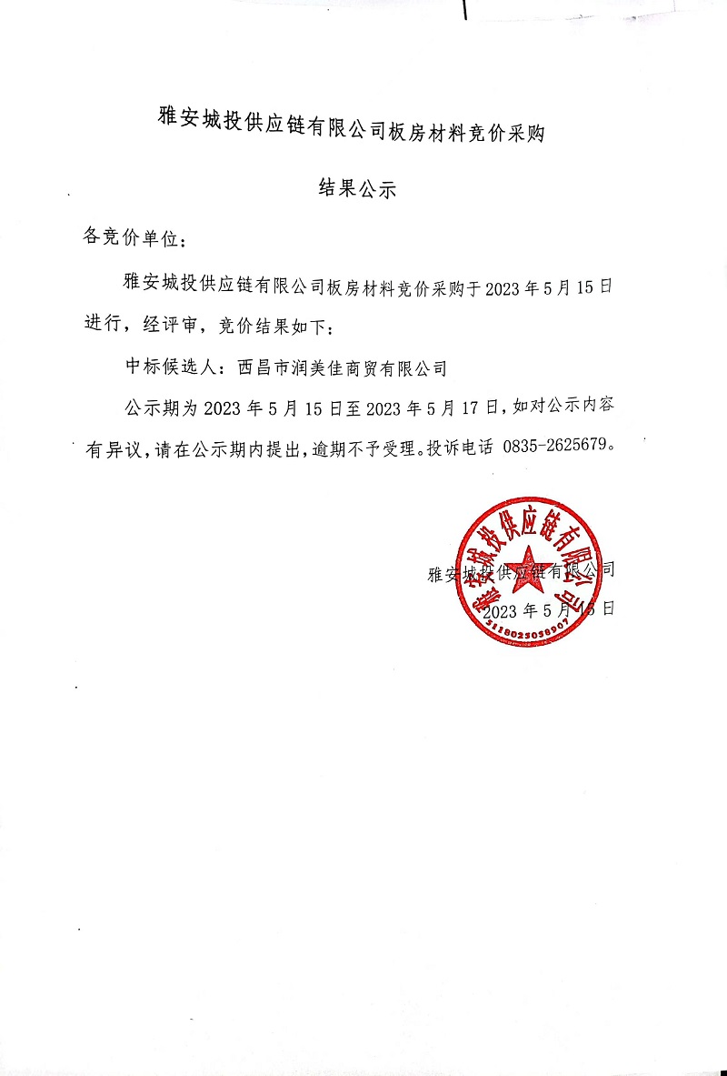 雅安城投供應鏈有限公司板房材料競價采購結(jié)果公示