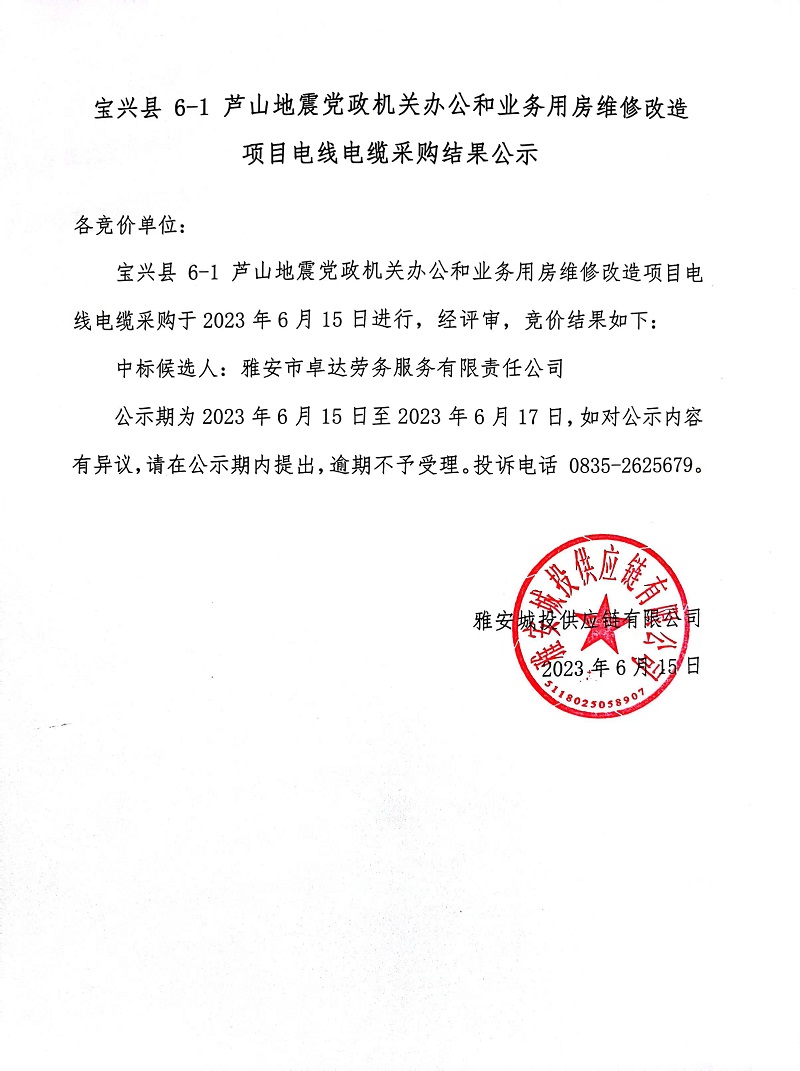 寶興縣 6-1 蘆山地震黨政機(jī)關(guān)辦公和業(yè)務(wù)用房維修改造項(xiàng)目電線電纜采購結(jié)果公示