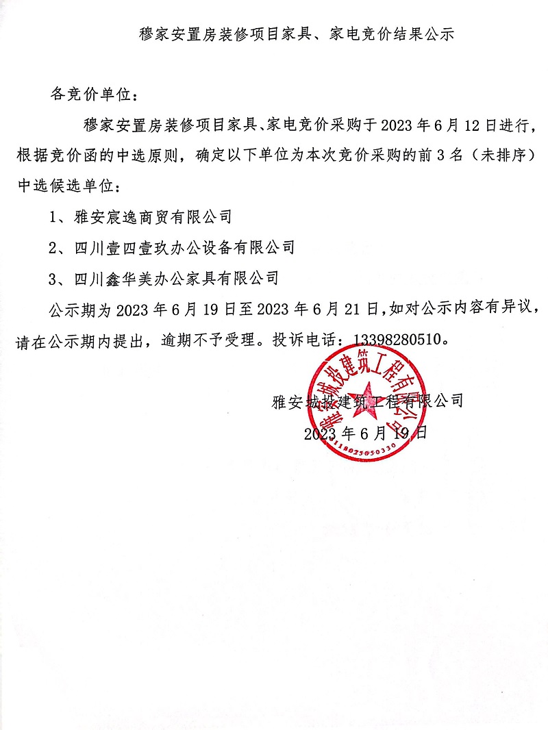 穆家安置房裝修項(xiàng)目家具、家電競(jìng)價(jià)結(jié)果公示