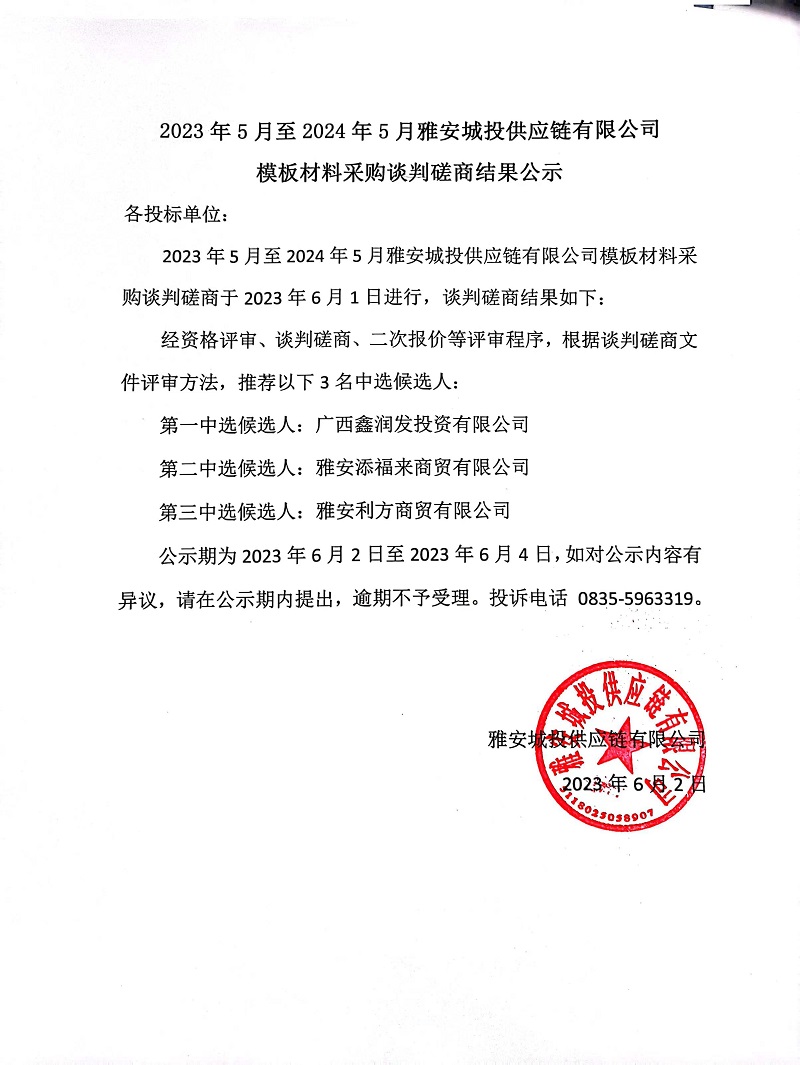 2203年5月至2024年5月雅安城投供應(yīng)鏈有限公司模板材料采購(gòu)談判磋商結(jié)果公示