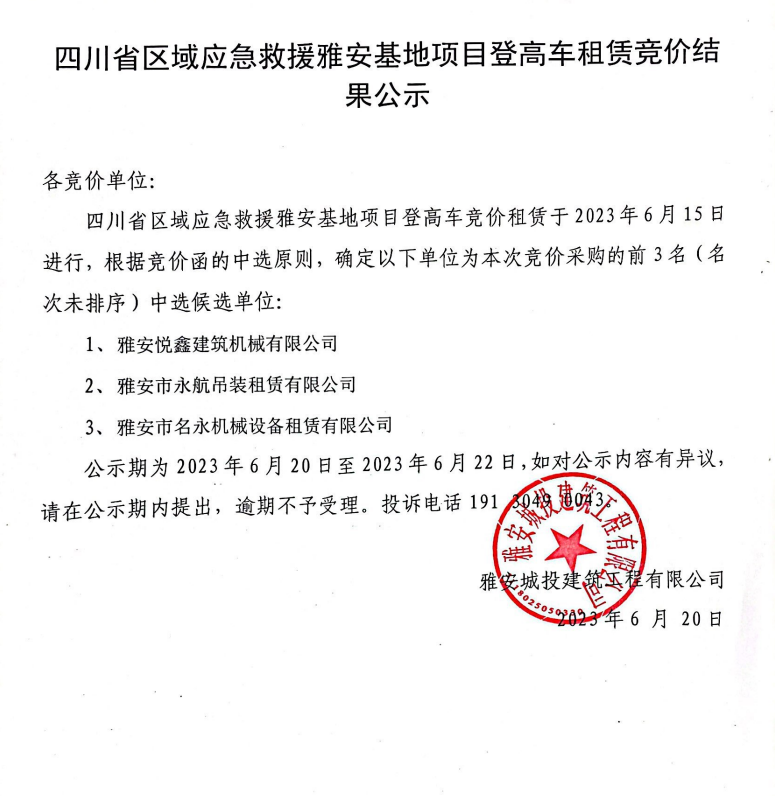 四川省區(qū)域應(yīng)急救援雅安基地項(xiàng)目登高車租賃競(jìng)價(jià)結(jié)果公示