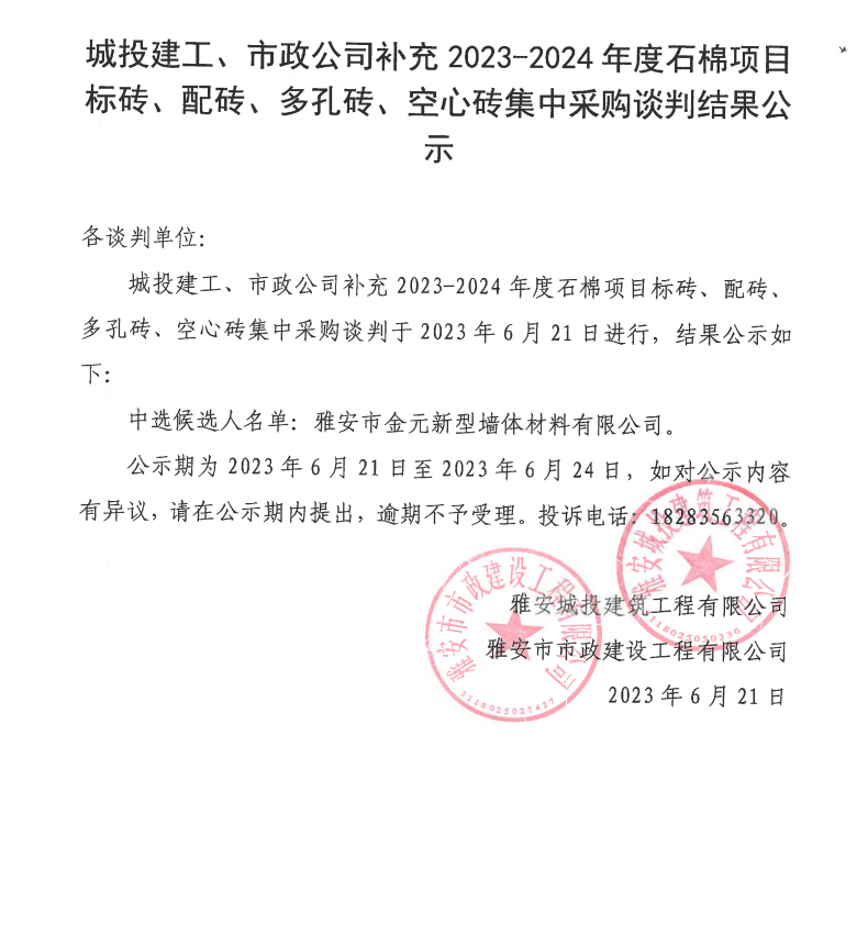 城投建工、市政公司補充2023-2024年度石棉項目標磚、配磚、多孔磚、空心磚集中采購談判結(jié)果公示