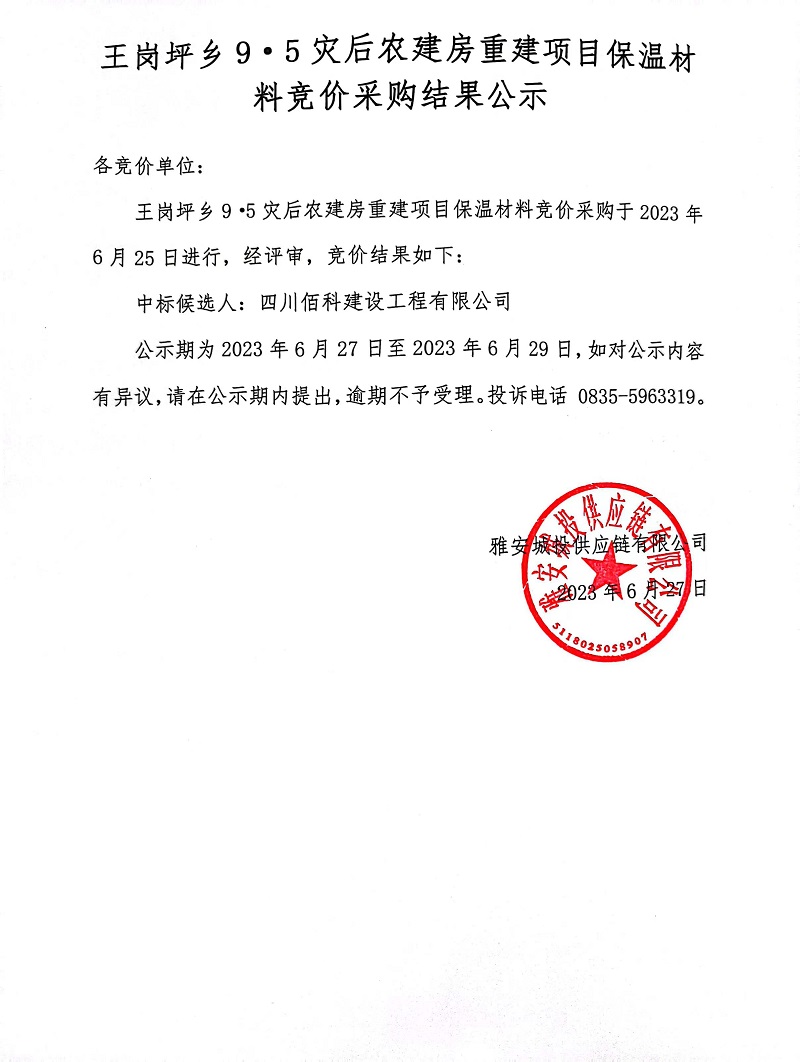 王崗坪鄉(xiāng)9·5災(zāi)后農(nóng)建房重建項(xiàng)目保溫材料競(jìng)價(jià)采購(gòu)結(jié)果公示