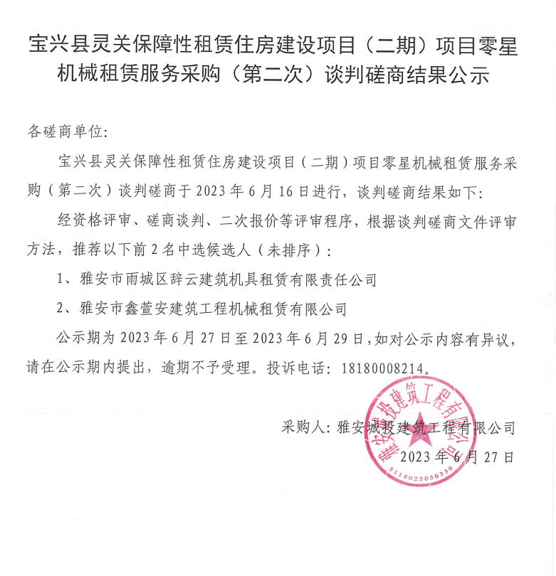 寶興縣靈關保障性租賃住房建設項目(二期)項目零星機械租賃服務采購(二次)談判磋商結果公示