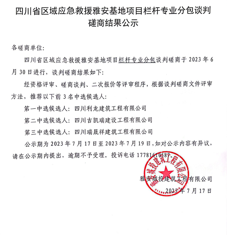 四川省區(qū)域應(yīng)急救援雅安基地項目欄桿專業(yè)分包談判磋商結(jié)果公示