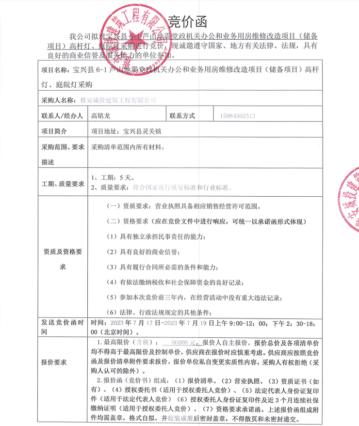 寶興縣6-1蘆山地震黨政機(jī)關(guān)辦公和業(yè)務(wù)用房維修改造項(xiàng)目(儲(chǔ)備項(xiàng)目)高桿燈、庭院燈采購(gòu)競(jìng)價(jià)公告