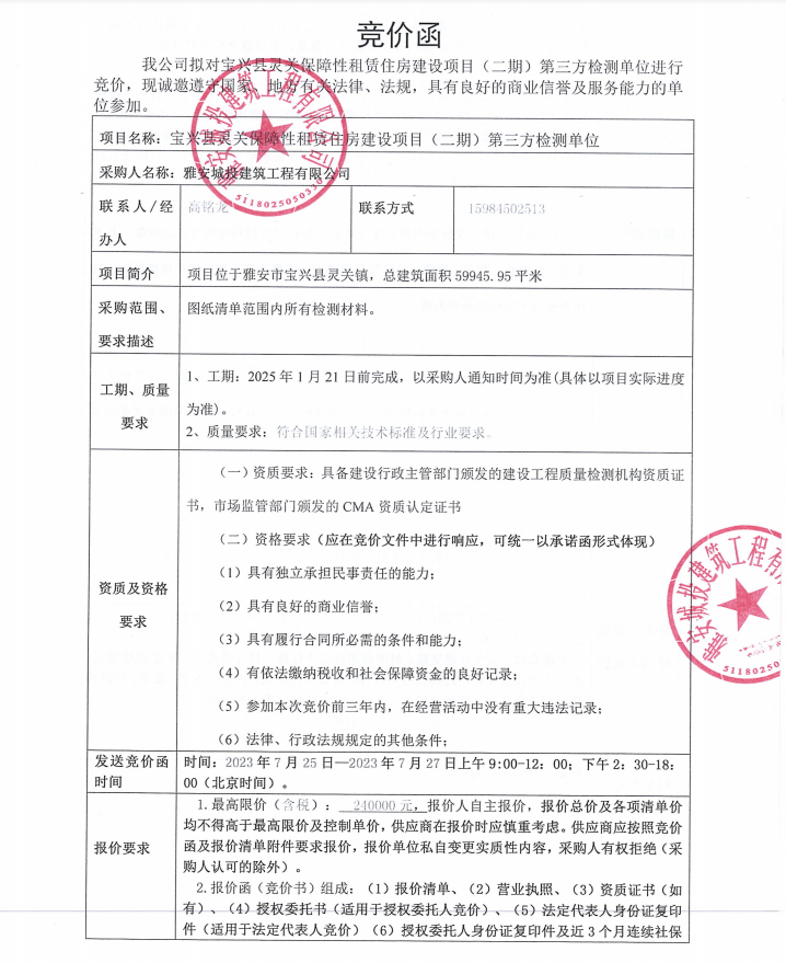 寶興縣靈關(guān)保障性租賃住房建設(shè)項目(二期)第三方檢測單位競價公告