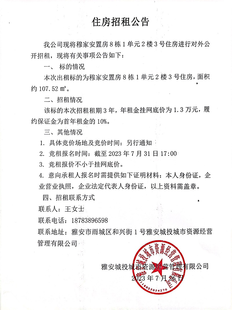 穆家安置房8棟1單元2樓3號(hào)住房招租公告