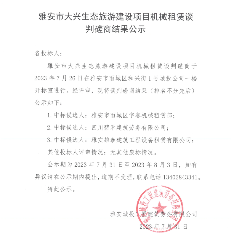 雅安市大興生態(tài)旅游建設(shè)項目機械租賃談判磋商結(jié)果公示