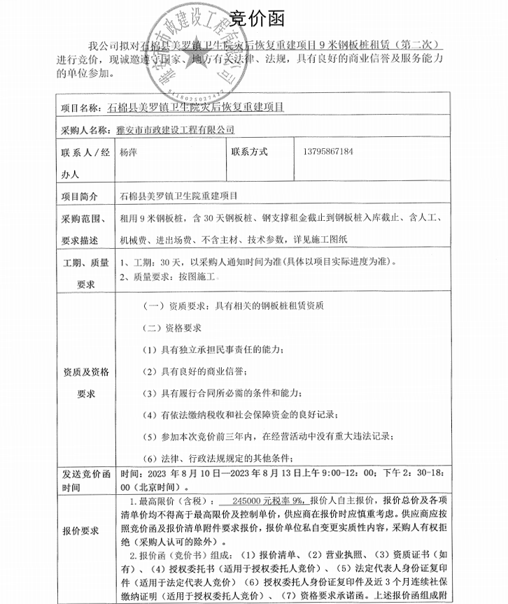 石棉縣美羅鎮(zhèn)衛(wèi)生院災(zāi)后恢復(fù)重建項(xiàng)目9米鋼板樁租賃(第二次)競(jìng)價(jià)公告