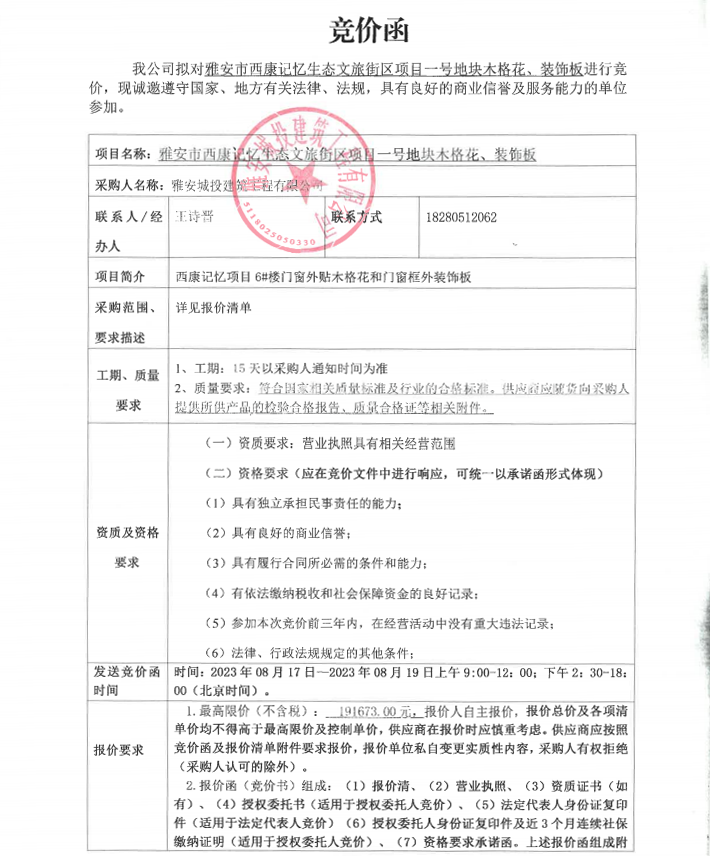 雅安市西康記憶生態(tài)文旅街區(qū)項(xiàng)目一號(hào)地塊木格花、裝飾板采購競價(jià)公告
